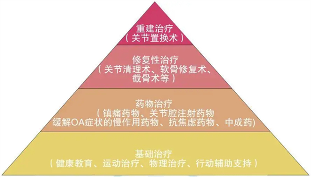 阶梯治疗是目前公认的膝关节骨性关节的科学治疗方案,其核心原则是:从简单温和的治疗到“大修大动”,根据不同病情轻重程度予以不同的治疗手段,以最小代价实现最大疗效。