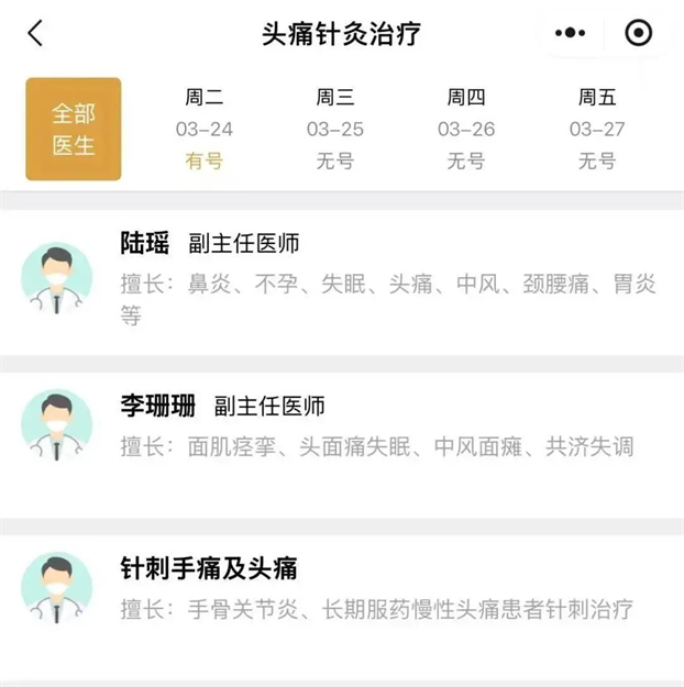 线上预约:广安门医院微信小程序/APP,点击「预约挂号」→选择「按专题」→选择「头痛针灸治疗」→选择「出诊专家」,完成预约。