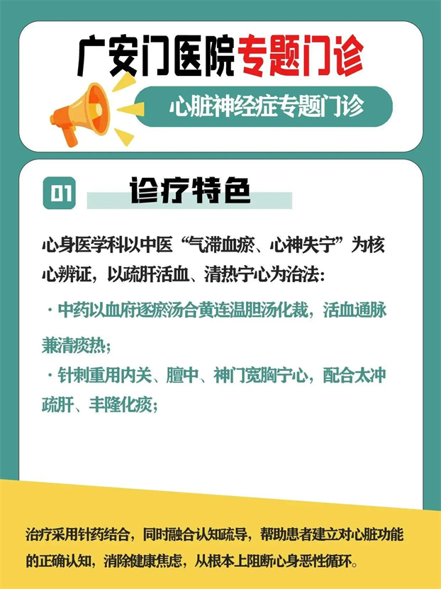 就诊须知:初诊请携带既往心脏检查报告(如心电图、动态心电图、超声、冠脉CTA等);如确认无器质性心脏病,本科室可直接开展中医综合治疗。如正在服用精神类药物,请务必如实告知医师。