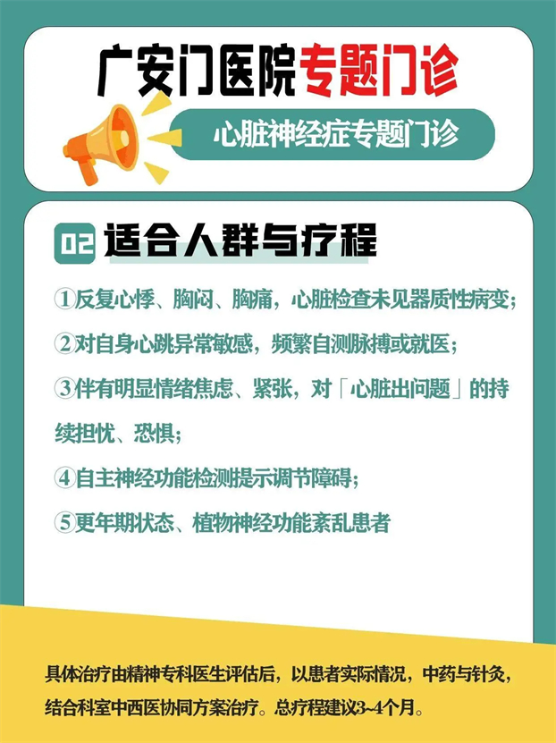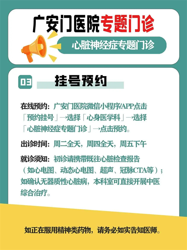 线上预约:广安门医院微信小程序/APP,点击「预约挂号」→选择「心身医学科」→选择「心脏神经症专题门诊」→选择就诊时间段,完成预约。