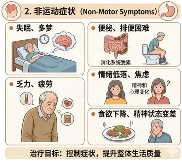帕金森病影响的,除了“能不能动”,还有“睡得好不好、吃得香不香、过得舒不舒服”。因此,帕金森病的治疗目标不仅是控制某一个症状,而是改善整体功能和生活质量。