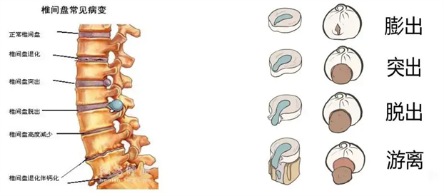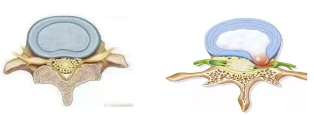 退变:随着年龄增长,髓核脱水退变,导致纤维环受力不均,纤维环破损,椎间盘突出。