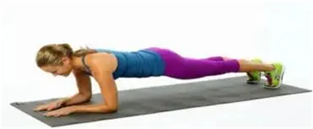 3.平板支撑:双脚微微打开,脚尖着地,与肩同宽,并用两手手肘撑地。腹部和臀部、腿部的肌肉用力撑起身体,除了前臂和脚尖,其他身体部位都必须离地臀部往内缩,背脊打直,脸朝下看,使得整个身体呈平板状。约30秒一组,休息一分钟,做五组左右。注意:整个过程中肩部、腹部、臀部都必须用力,切记不是只靠手臂支撑。