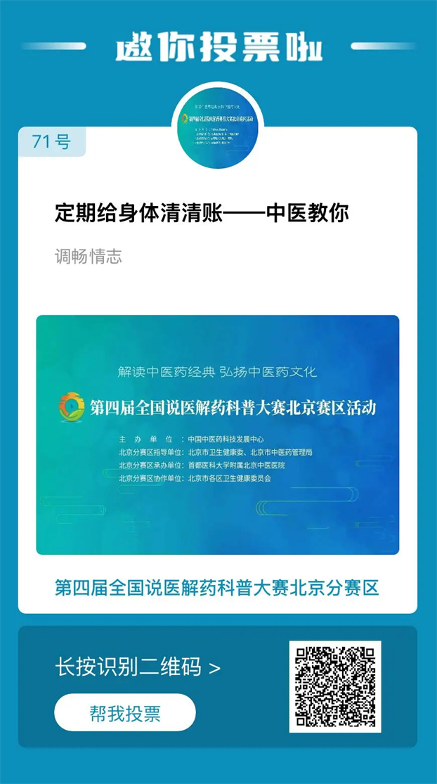 第四届全国说医解药科普大赛(北京赛区)线上展播投票通道正式开启!广安门医院国际医疗部、眼科、心血管科、药学部原创科普作品期待您的关注。从中医院一线视角,带来不一样的科普体验,传递纯粹、科学、严谨的健康养生理念,弘扬生动、轻松、有趣的中医药文化。欢迎围观,为您心仪的作品投票,为中医打Call!