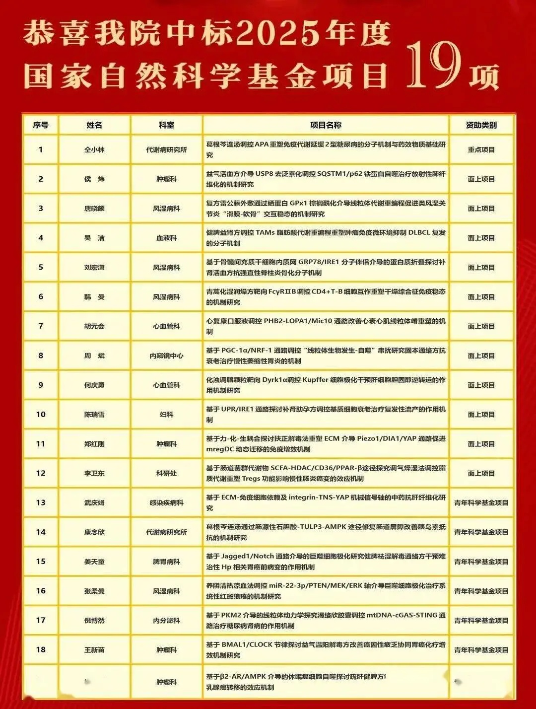 8月,2025年度国家自然科学基金项目公布,我院获得基金资助19项,其中重点项目1项、面上项目11项、青年科学基金项目7项,科研项目的丰硕成果彰显了医院在中医药领域的科研实力与创新潜力。