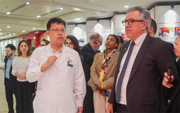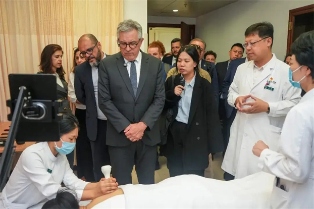 帕迪利亚部长对广安门医院的中医药特色优势与国际交流成果给予高度评价。他表示,此次参观让巴西代表团对中医药有了进一步了解。当前在巴西,中医药技术,尤其是针灸、拔罐、推拿等疗法和适宜技术,正像其他“中国制造”一样进入巴西社会,融入巴西民众生活。帕迪利亚部长指出“巴西正致力于完善基层卫生服务体系、推动传统医学与现代医学融合发展,中医药无疑是重要的合作资源。”希望未来能继续与中方在人才培养、技术推广、卫生政策交流等方面开展深度交流,共同推动中巴卫生健康事业发展。