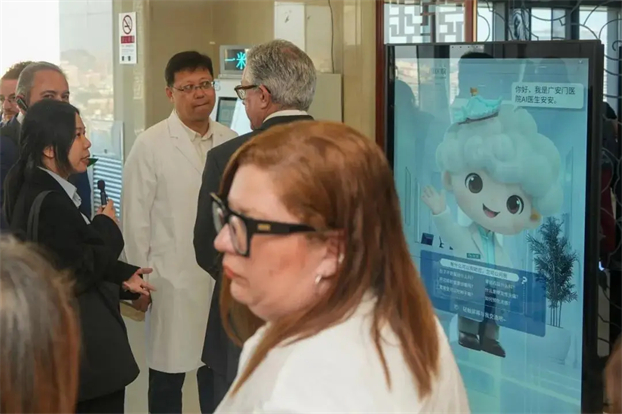 在中医智慧服务体验区,搭载国内首款中医AI大模型“广医·岐智”2.0版的智慧互动数字形象“安安”吸引了代表团成员的目光。当了解到患者可通过互动对话智能完成问诊导诊、体质辨识,医生可借助智慧平台为患者提供辨证施治服务时,代表团成员指出“传统医学与数字技术的结合,为卫生服务效率提升提供了新思路”。