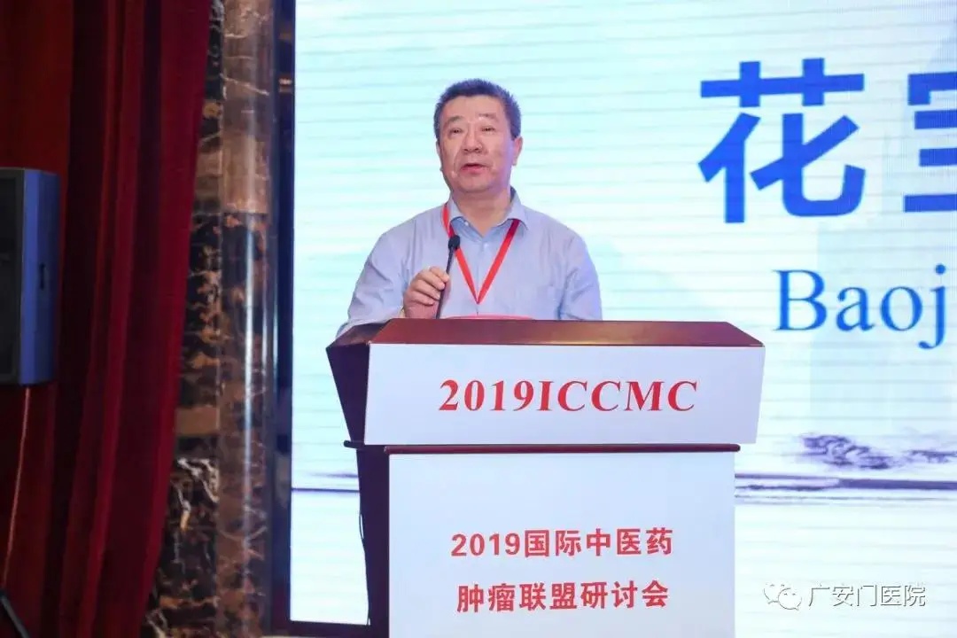 2019年,花宝金在广安门医院承办2019国际中医药肿瘤联盟研讨会上致辞