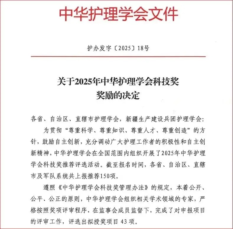 “中华护理学会科技奖”作为我国护理领域最具权威性的科学技术奖项,由各省市护理学会经过严格评选后限额推荐至中华护理学会。2025年共有150个项目参与评选,经过初审、复审及终审,共评选出43项中华护理学会科技奖,其中一等奖4项,二等奖14项,三等奖25项。