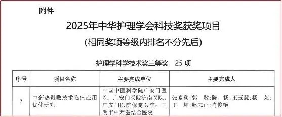 近日,中华护理学会发布《关于2025年中华护理学会科技奖奖励的决定》。广安门医院护理团队“中药热熨敷技术临床应用优化研究”获得中华护理学会2025年度科技奖三等奖。