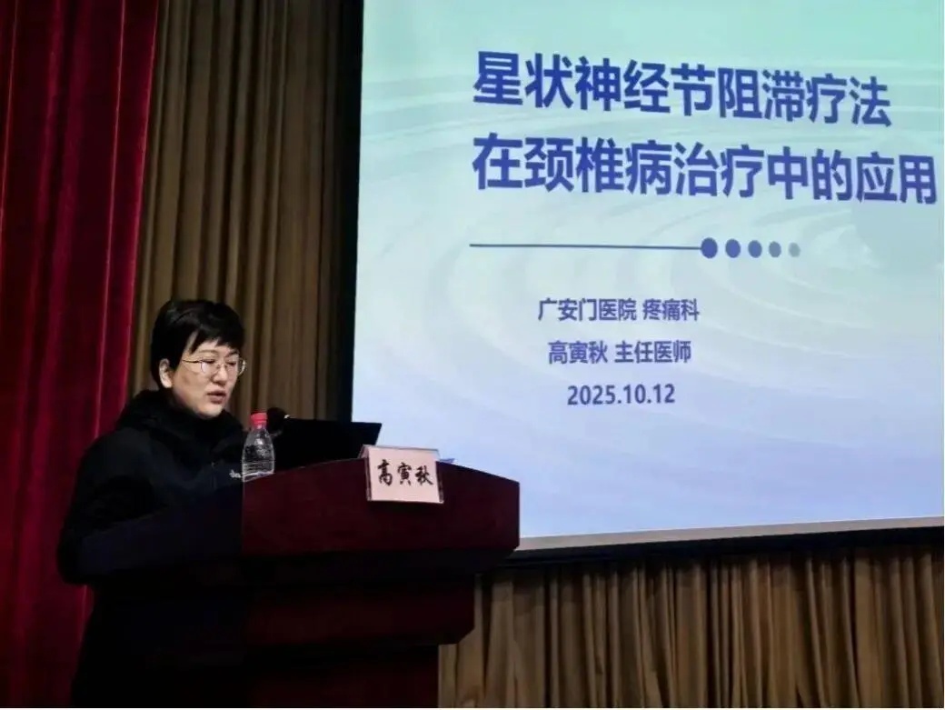 我院疼痛科主任高寅秋以《星状神经节阻滞在颈椎病治疗中的应用》为题,回顾该技术从经验操作向超声引导下精准治疗的发展历程,详解超声入路、并发症防控及护理要点,为护理人员协同治疗与病情观察提供了专业依据。