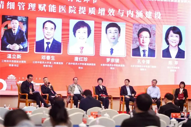 讨论环节,三明市中西医结合医院党委书记温立新、江西中医药大学第二附属医院党委书记邓春生、广西中医药大学附属瑞康医院院长唐红珍、长春中医药大学附属医院院长罗宗健、 北京中医药大学东直门医院副院长孔令博、佛山市中医院副院长陈苹围绕“精细管理赋能医院提质增效与内涵建设”展开讨论。甘肃省中医院党委书记郭峰主持讨论。