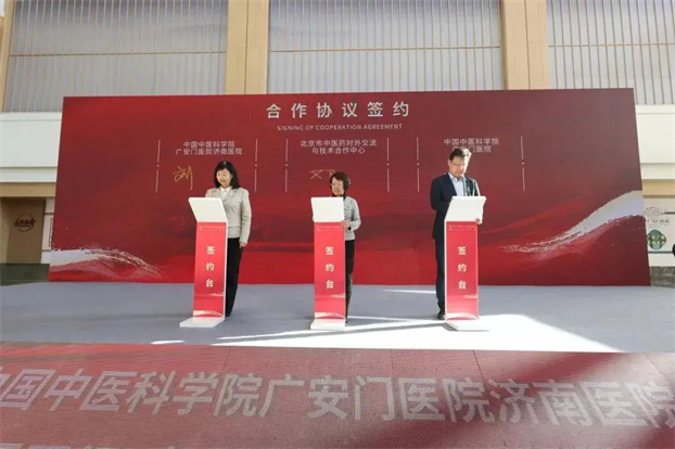 北京市中医药对外交流与技术合作中心、广安门医院、济南医院三方联合签约。北京市中医药管理局中医药对外交流与技术合作中心主任邓娟(中)参加签约