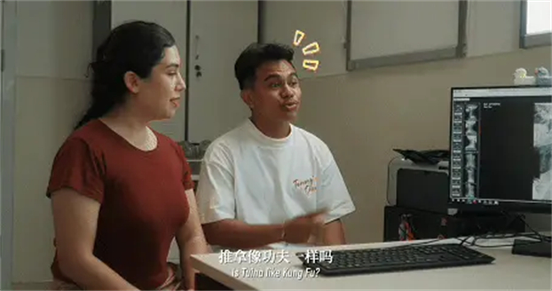 居然把推拿和功夫“化骨掌”联系起来,不愧是外国学子眼里的中国功夫印象~本来还挺严肃的治疗场景,被他这么一说,瞬间变得趣味十足,更期待推拿的“功夫实力”了!