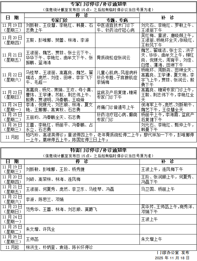 广安门医院专家门诊停诊/补诊通知单