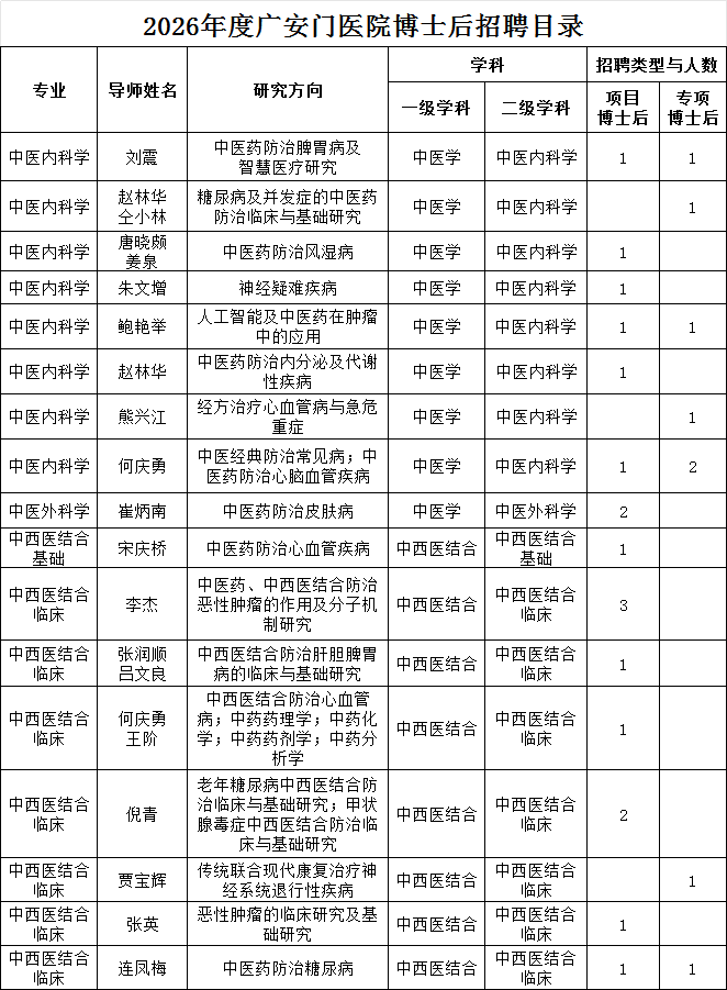 中国中医科学院广安门医院2026年度博士后招聘计划