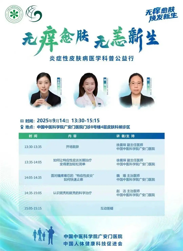权威专家面对面指导:皮肤科医生将现场解读特应性皮炎的成因、症状与诊疗误区,用通俗语言拆解专业知识,让你听得懂、用得上。
