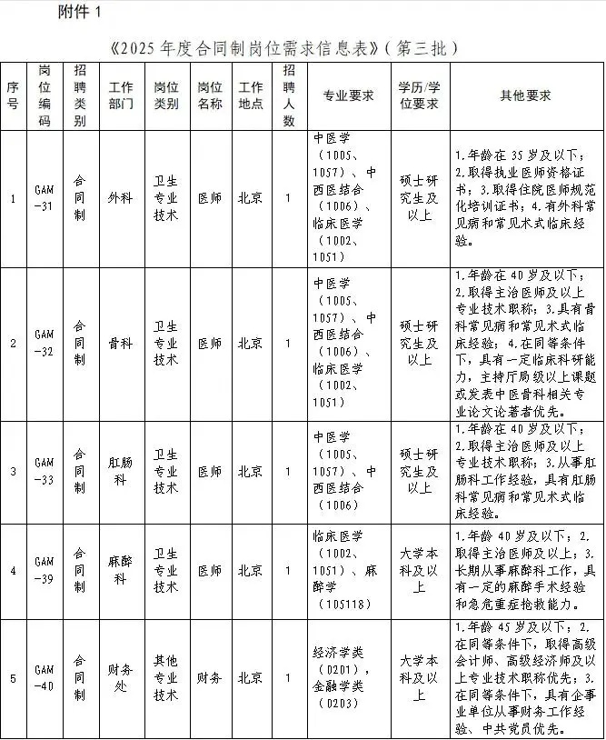 根据工作需要,2025年中国中医科学院广安门医院公开招聘合同制工作人员5名。现将有关事项公告如下: