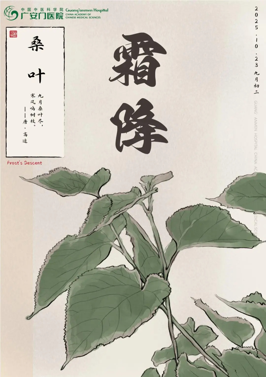 霜降之霜 桑 叶 霜降,是秋季的最后一个节气,也是秋季到冬季的过渡,天气变冷,露水凝结成霜。除了红叶、柿子这些霜降特产,还有一味中药——霜桑叶,正是其采收时节。《本草纲目》中记载:“桑叶,以老而经霜者为佳,欲其气之全、力之厚也。” 桑叶,桑科植物桑的干燥老叶。味苦、甘,性寒。归肺、肝经。疏散风热,清肺润燥,平肝明目,凉血止血。风热感冒,温病初起,肺热咳嗽,肝阳上亢眩晕,目赤昏花,血热妄行之咳血、吐血。