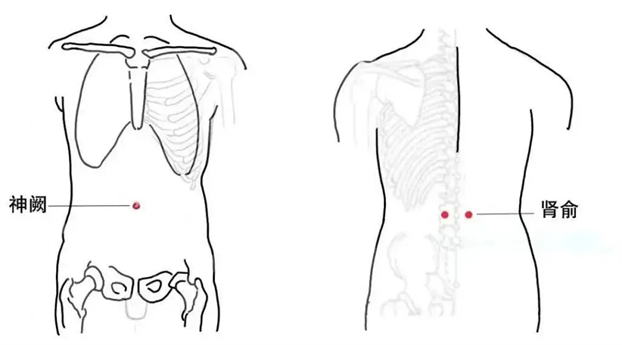 神阙(脐中部、脐中央)、双侧肾俞(第2腰椎棘突下旁开1.5寸)。
