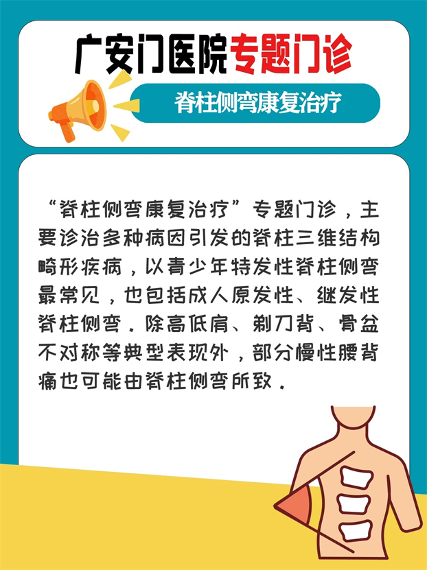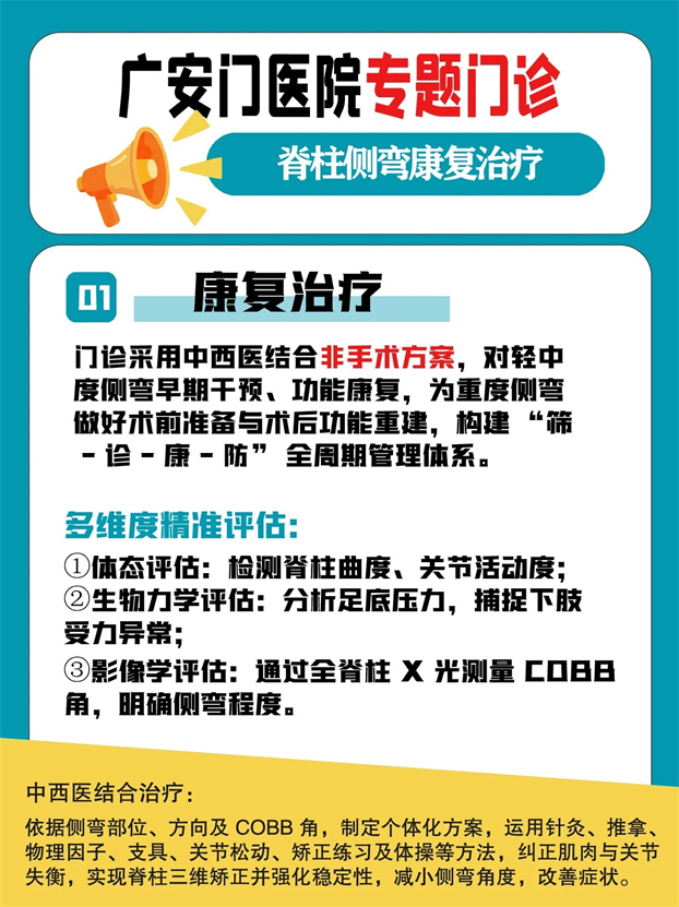 “脊柱侧弯康复治疗”专题门诊,通过中医传统疗法与现代康复方法相结合的非手术方案,对轻中度侧弯进行早期干预和功能康复,对重度侧弯进行术前康复准备和术后功能重建,构建"筛-诊-康-防"全周期管理体系。