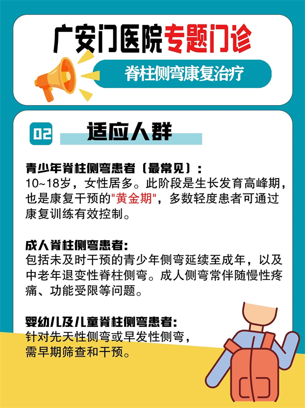 青少年脊柱侧弯患者(最常见):10~18岁,女性居多。此阶段是生长发育高峰期,也是康复干预的"黄金期",多数轻度患者可通过康复训练有效控制。