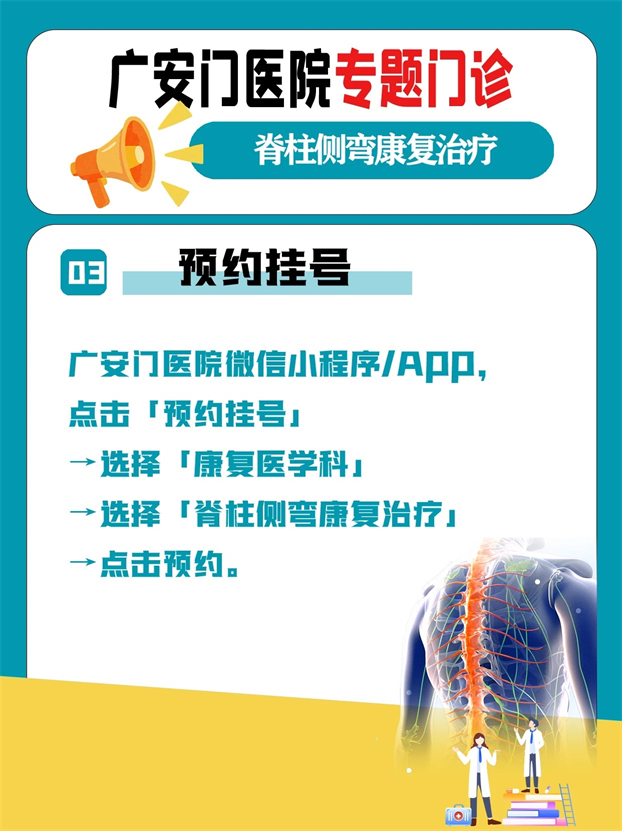 线上预约:广安门医院微信小程序/APP,点击「预约挂号」→选择「康复医学科」→「脊柱侧弯康复治疗(周六)」→点击预约。