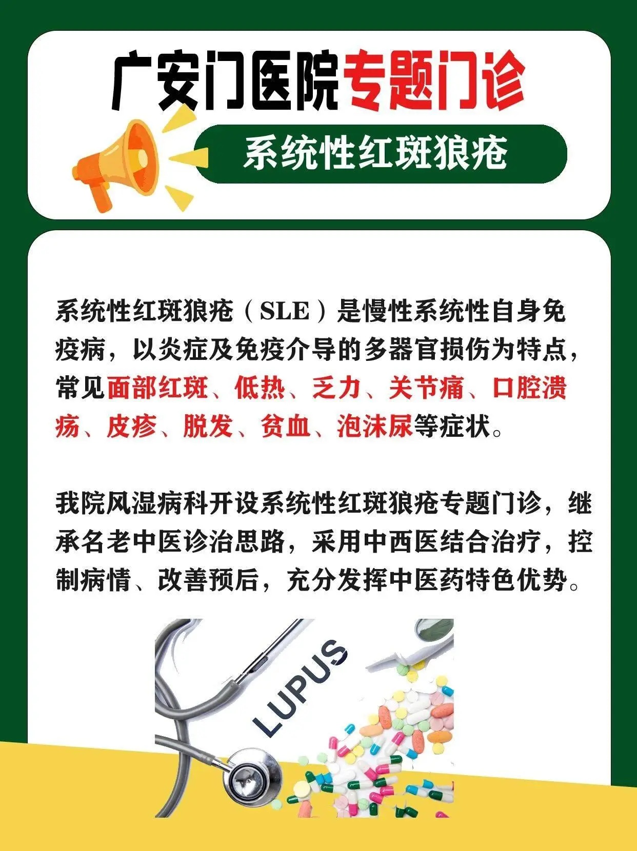 出诊时间:每周三上午“系统性红斑狼疮”专题门诊