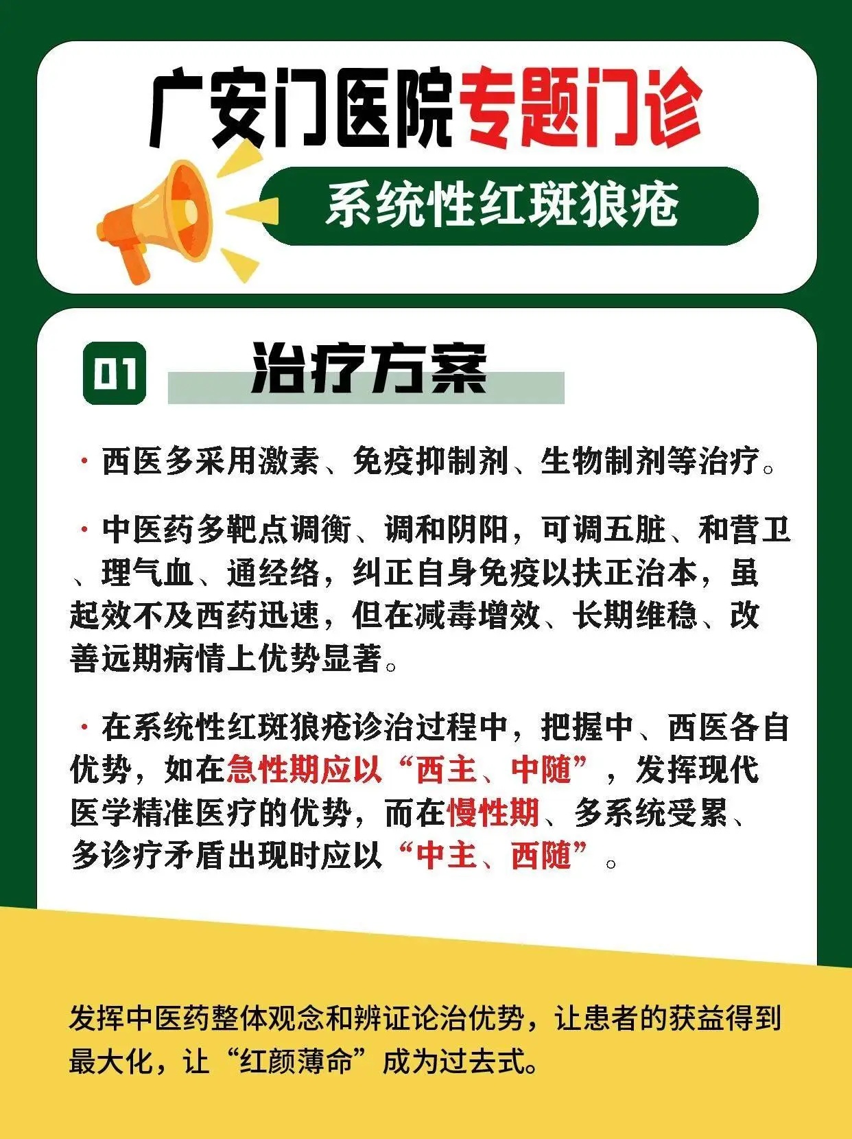 在系统性红斑狼疮诊治过程中,把握中、西医各自优势,如在急性期应以“西主、中随”,发挥现代医学精准医疗的优势,而在慢性期、多系统受累、多诊疗矛盾出现时应以“中主、西随”,发挥中医药整体观念和辨证论治优势,让患者的获益得到最大化,让“红颜薄命”成为过去式。