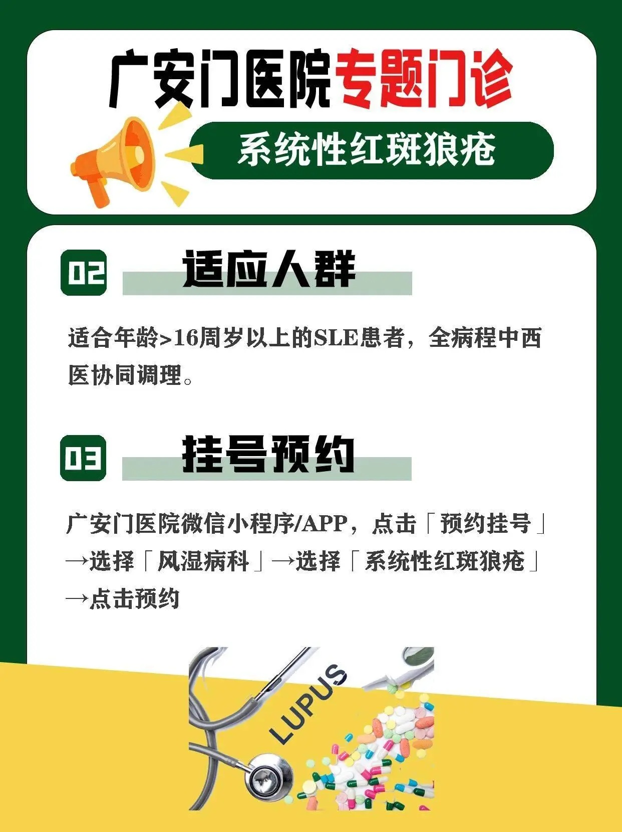 线上预约:广安门医院微信小程序/APP,点击「预约挂号」→选择「风湿病科」→选择「系统性红斑狼疮」→点击预约。