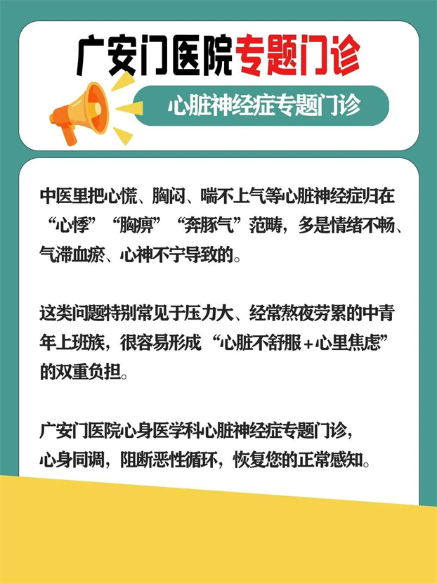 心脏神经症以心悸、胸闷、呼吸不畅为主要表现,无器质性病变,多为自主神经紊乱,与心理应激相关。中医属 “心悸”“胸痹”“奔豚气”,病机多为情志失调、气滞血瘀、心神失宁。好发于高压、疲劳的中青年脑力劳动者,易形成 “心脏‑心理” 双重负担。广安门医院心身医学科开设抑心脏神经症专题门诊,采用心身同调,阻断恶性循环,恢复正常感知。
