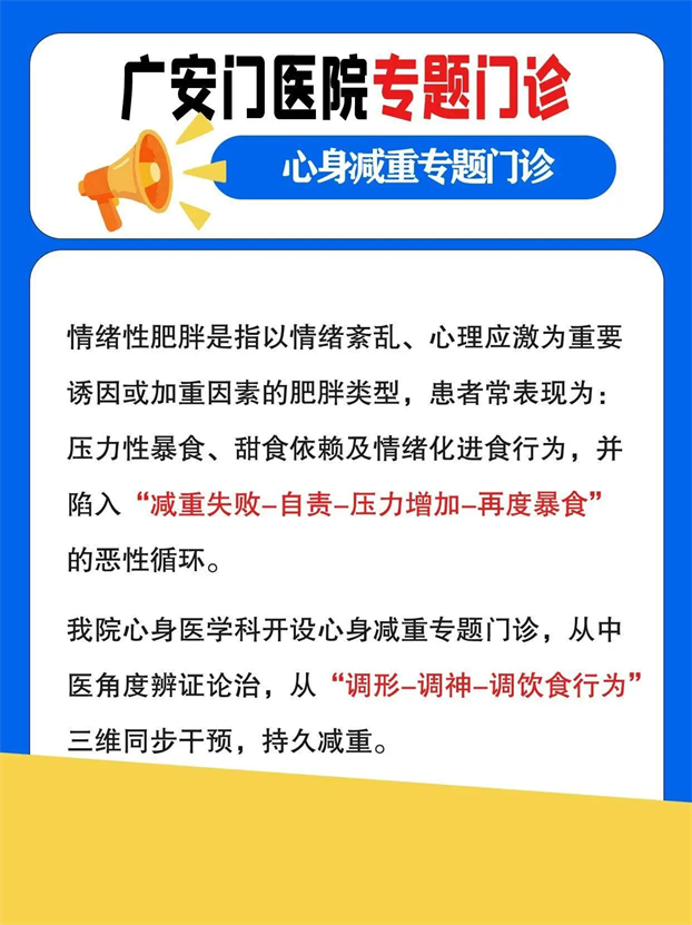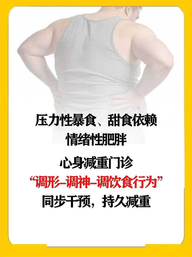 情绪性肥胖是指以情绪紊乱、心理应激为重要诱因或加重因素的肥胖类型,患者常表现为:压力性暴食、甜食依赖及情绪化进食行为,并陷入“减重失败-自责-压力增加-再度暴食”的恶性循环。心身医学科开设心身减重专题门诊,从中医角度辨证论治,从“调形-调神-调饮食行为”三维同步干预,持久减重。