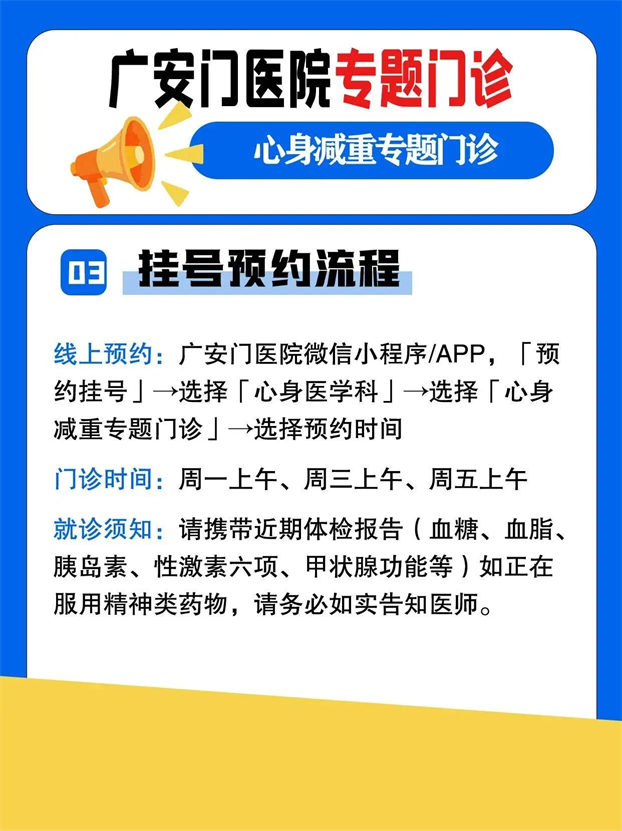 线上预约:广安门医院微信小程序/APP,点击「预约挂号」→选择「心身医学科」→选择「心身减重专题门诊」→选择预约时间。