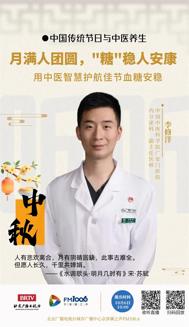 当中秋团圆盛宴遇上血糖隐忧,月饼这份节日的象征竟成了甜蜜的负担?中秋月圆时,这份甜蜜如何安心享用?广安门医院内分泌科副主任医师李修洋做客京津冀之声FM100.6,中医智慧护航佳节血糖安稳,带您探寻“中秋月圆人安康”的养生之道。从中医“食养为本”的智慧出发,为您解答如何选择适合的月饼?怎样搭配能平衡餐后血糖?在传承文化的同时,如何守护家人健康?打破“过节必伤身”的误区,提供实用易行的血糖管理方案,让您既品味传统文化,又践行健康理念。月圆人团圆,健康才是最好的祝福。