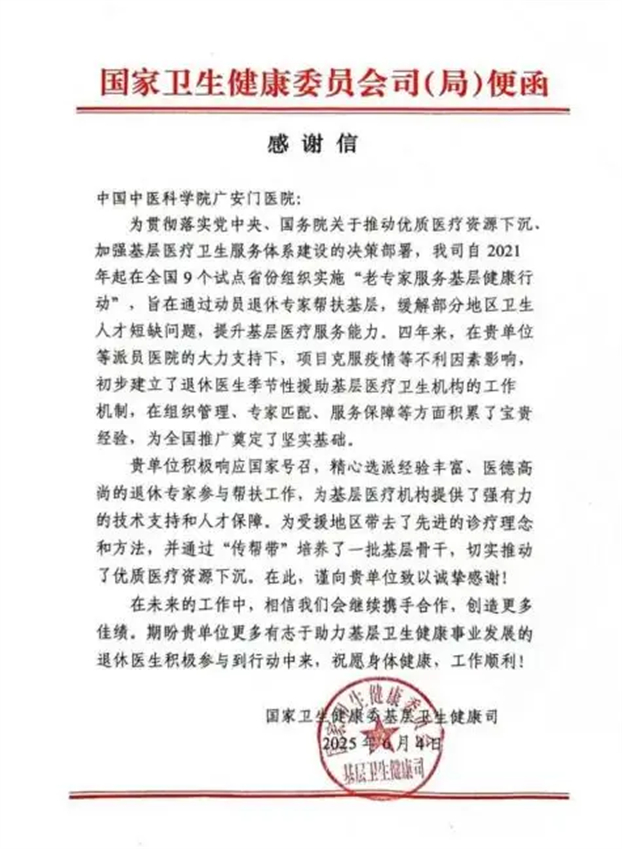 近日,国家卫生健康委与国家中医药管理局联合召开工作会议,全面总结过往工作,隆重表彰先进典型,并对本年度工作方案作出系统部署。会上,国家卫生健康委基层司、国家中医药管理局医政司对三位连续四年坚守支援基层一线的老专家予以表彰。其中,我院肛肠科退休专家芮洪顺、推拿科退休专家田树春两位同志获此殊荣。同期,国家卫生健康委特向我院发来感谢信,高度赞誉我院在支援基层工作中作出的突出贡献。此次表彰充分体现了国家层面对我院相关工作的高度认可与鼓励。