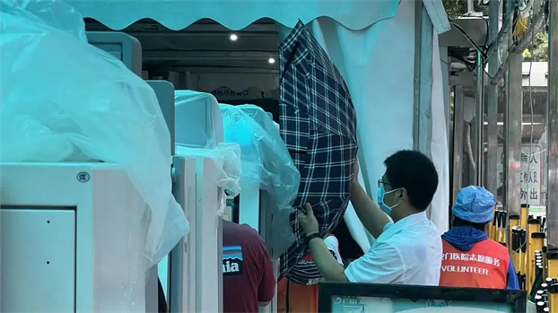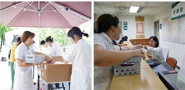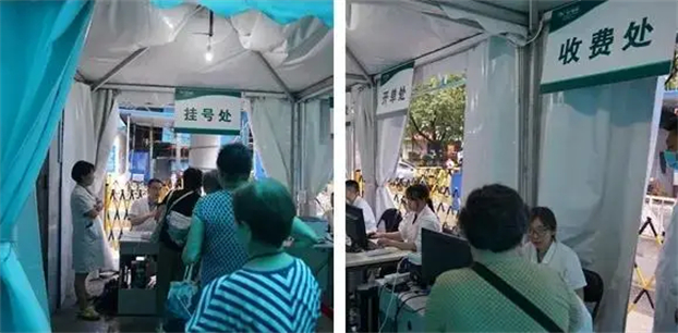 大雨中,挂号收费、财务、信息联合作业,保洁人员及时清理地面的积水,保持环境整洁,保安、志愿者们则穿梭在人群中,为患者提供咨询和帮助,指引他们前往各个贴敷区域,工会为工作人员送去解暑酸梅汤和绿豆汤。他们表示,患者的信任不能辜负,会尽全力为医生和患者提良好的保障服务。
