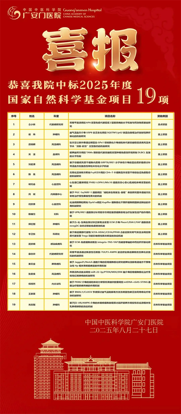 近年来全国国家自然科学基金项目申报数量屡创新高,项目的资助率持续走低,项目中标难度逐年增大。我院取得这一成果显得尤为珍贵,在此向获得项目资助的同仁表示祝贺,希望我院广大临床科研人员,继续再接再厉,充分发挥创新活力,推动引领医院高质量发展。