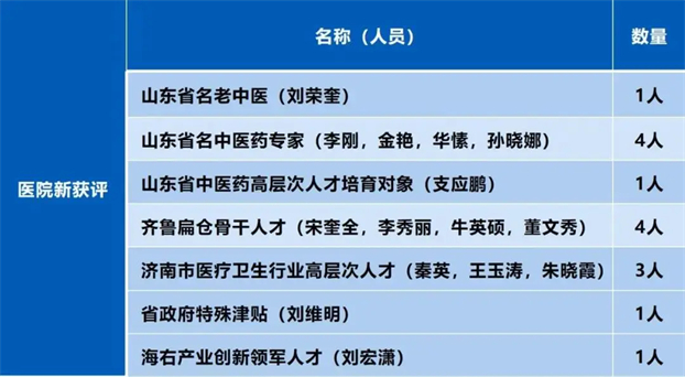 2024年以来,人才培育成果丰硕,获评山东省名老中医1人及中医药专家4人、全省中医药高层次人才培育对象1人、齐鲁扁仓骨干人才4人、济南市医疗卫生行业高层次人才3人,省政府特殊津贴1人,海右产业创新领军人才1人,9个师承组成功入选济南市第五批“薪火传承231工程”。同时,为人才成长搭建高端平台,实施“岐黄人才腾飞计划”“新苗护理人才”“药学菁英成才”等培养工程。