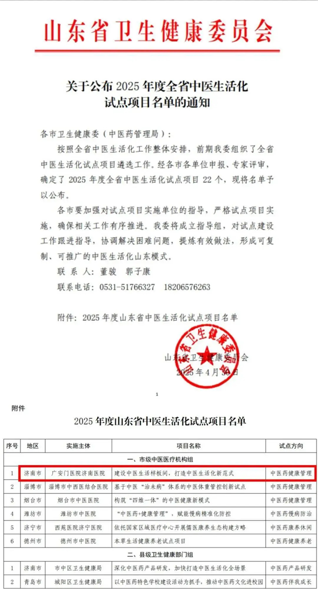 2025年4月30日,《建设中医生活样板间 打造中医生活化新范式》项目入选2025年度全省中医生活化试点项目(济南市唯一入选医疗机构),通过中医健康管理场景构建与适宜技术推广,推动中医药融入群众日常生活。
