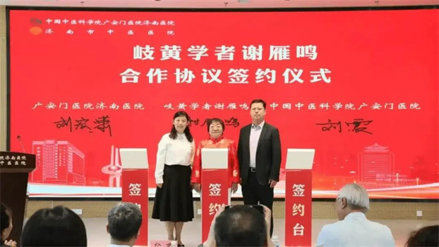 依托广安门医院师资优势实现中医药人才“传、帮、带”系统培养,同时借助学术合作资源丰富教学内容。在传承体系建设上,以名家工作室为核心载体,2024年4月20日,成立“全国名老中医药专家冯兴华传承工作室”“全国名老中医药专家谢雁鸣传承工作室”。2024年7月19日,举办中国中医科学院广安门医院、中国中医科学院广安门医院济南医院与国医大师王庆国、岐黄学者谢雁鸣合作协议签约仪式及国医大师王庆国传承工作室揭牌仪式,国医大师传承工作室正式落户泉城。2024年12月21日,成立岐黄学者姜泉传承工作室。2025年4月23日,成立国医大师王新陆血浊研究工作室。