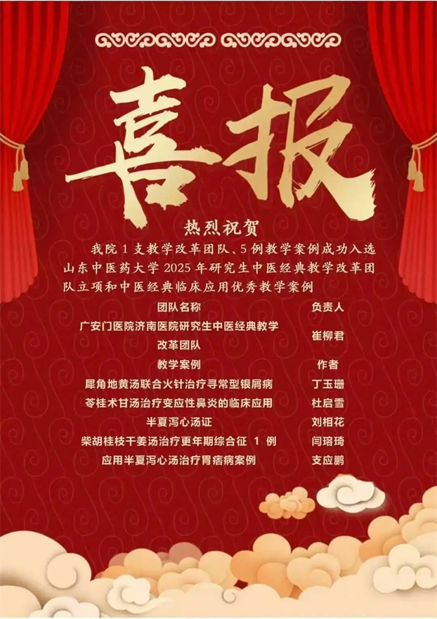 在规培与教学提升上,强化国家级中医医师规范化培训基地建设:2024年8月9日、2025年3月25日先后迎接山东省专家组评估督导,优化制度体系。2025年2月20日,召开“学习新标准、争创‘规培教学示范科室’”启动会暨中医规培师资培训会。2025年5月26日,1支团队入选山东中医药大学研究生中医经典教学改革团队,5例案例获评优秀教学案例。