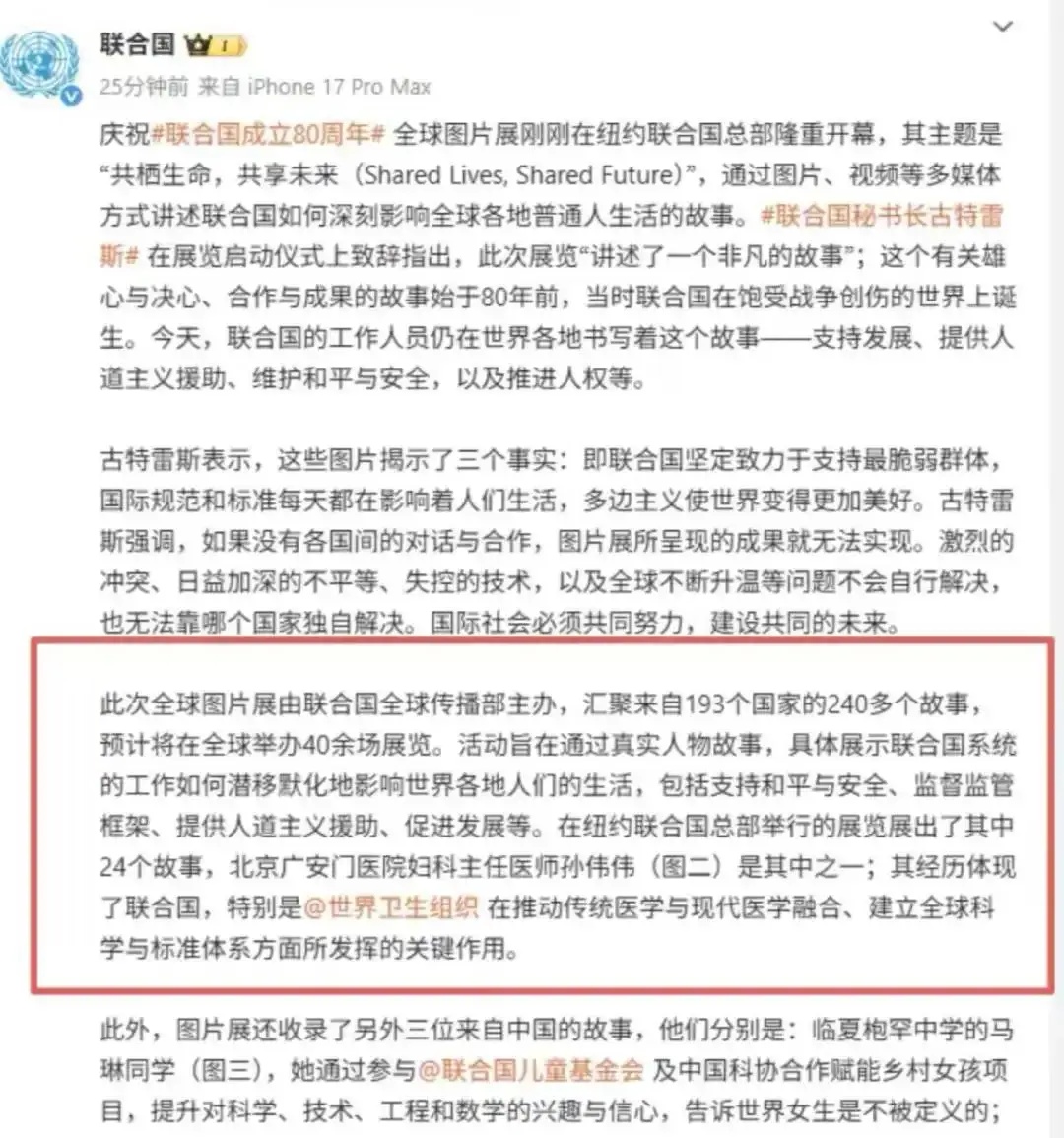 在纽约联合国总部举行的展览将展出其中24个故事,中国妇科女医生孙伟伟的故事是其中之一。其经历体现了联合国,特别是世界卫生组织在推动传统医学与现代医学融合、建立全球科学与标准体系方面所发挥的关键作用。