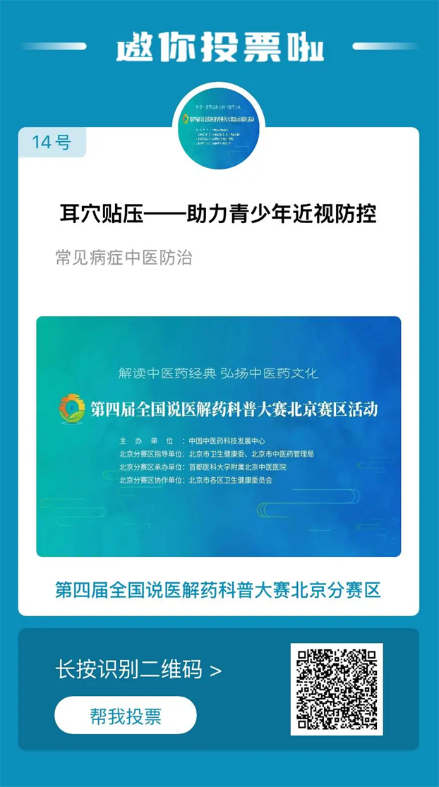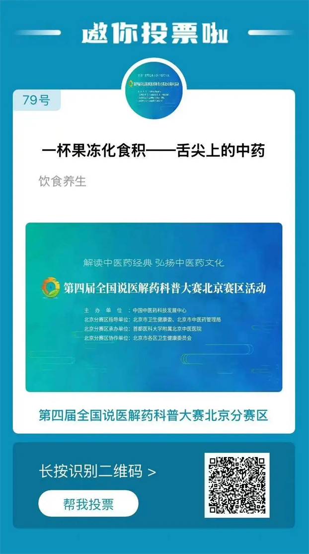 第四届全国说医解药科普大赛(北京赛区)线上展播投票通道正式开启!广安门医院国际医疗部、眼科、心血管科、药学部原创科普作品期待您的关注。从中医院一线视角,带来不一样的科普体验,传递纯粹、科学、严谨的健康养生理念,弘扬生动、轻松、有趣的中医药文化。欢迎围观,为您心仪的作品投票,为中医打Call!
