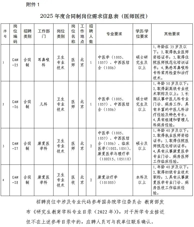 根据工作需要,2025年中国中医科学院广安门医院公开招聘合同制工作人员6名。现将有关事项公告如下: