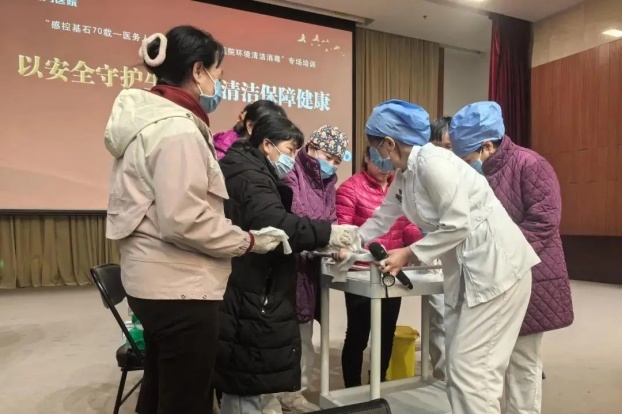 12月3日,我院感控办举办“感控基石70载——医务人员职业安全防护与医院环境清洁消毒”专题培训,培训以“以安全守护生命,以清洁保障健康”为主题,设置总院主会场 ,广安门医院保定医院、济南医院、黑龙江医院分会场,职能处室相关负责人、医务及后勤人员800余人,线下线上同步学习,共同夯实医患安全防线。