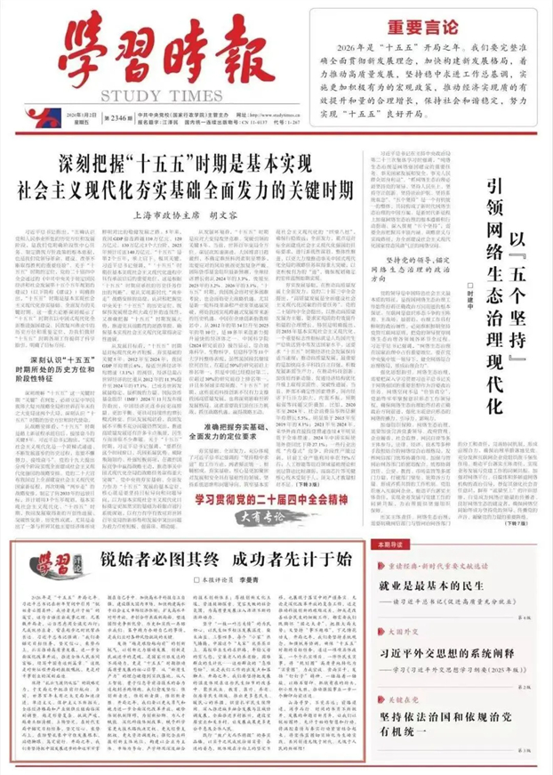 2026年是“十五五”开局之年。习近平总书记在新年贺词中引用“锐始者必图其终,成功者先计于始”的箴言,这句古语道出成事之理:凡果敢开局者,必当思虑周全谋定而行;凡成就功业者,皆在起步之时就擘画长远。习近平总书记强调:“我们要锚定目标任务,坚定信心、乘势而上,扎实推动高质量发展,进一步全面深化改革开放,推进全体人民共同富裕,续写中国奇迹新篇章。”这既是对新征程开局的殷殷嘱托,更是对干事创业的深刻启迪。