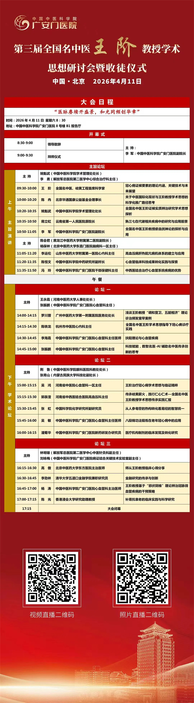 为传承全国名中医王阶教授学术思想,深入开展心血管疾病的中西医结合研究,推动中医药事业守正创新发展,由广安门医院心血管科主办,全国名中医王阶传承工作室、王阶全国名老中医药专家传承工作室及北京中医药薪火传承“3+3”工程王阶名医传承工作站承办,“第三届全国名中医王阶教授学术思想研讨会暨收徒仪式”将于4月11日(本周六)召开。 诚邀您共襄盛会。