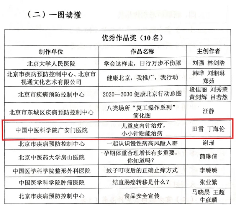 12月1日,广安门医院官方微信号荣获2020年“健康北京”科普作品征集大赛“官方微信优秀作品奖”。“儿童皮内针治疗-小儿针贴能治病”荣获“一图读懂类科普”优秀作品奖。