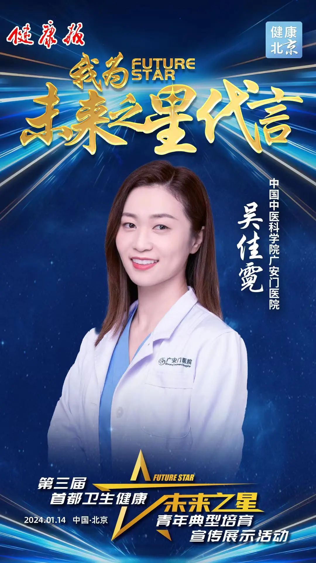 1月14日,由北京市卫健委指导,健康报社与“健康北京”政务新媒体共同主办的第三届首都卫生健康“未来之星”青年典型培育首轮宣传展示活动在京成功举行。来自各区卫生健康委、各三级医院、各直属单位等推选出64名“未来之星”青年典型培育宣传对象参与展示活动。经过精彩展示和评选,我院针灸科副主任医师吴佳霓在首轮个人风采展示中脱颖而出,荣获“逐梦新星”称号。