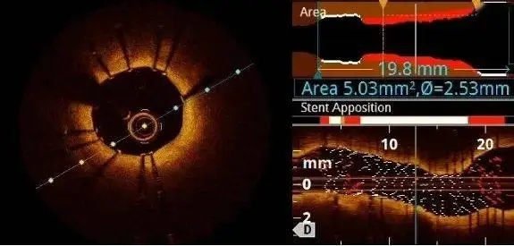 在OCT的精准指导下植入支架治疗,支架近端和远端定位合适,支架植入后OCT精确展现了支架局部的膨胀不良及贴壁不良,采用后扩张球囊高压扩张消除了上述情况,优化了支架植入后的结果。术后结果非常满意。